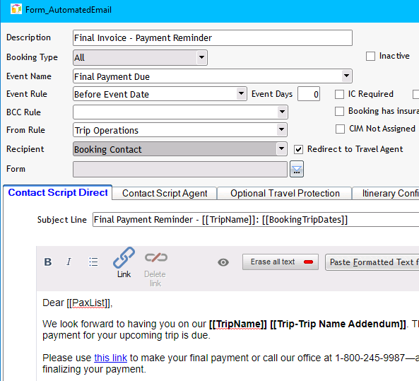 Streamline client communications — including upcoming and overdue payment reminders, final documents, payment acknowledgments, welcome-home messages, and trip evaluations.
